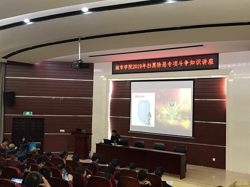 为进一步提高党员对“扫黑除恶”专项斗争工作的认识,推动新迎校区“扫黑除恶”专项斗争工作稳定有序开展。3月27日,东华派出所张涛同志到城市学院举行了 “扫黑除恶专项斗争知识讲座”,校区后勤直属党支部19人参加讲座。