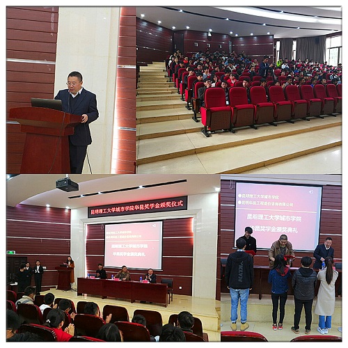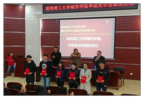 王松江院长与华昆造价咨询有限公司总经理王洁在典礼中先后致辞,指出校企合作是贯彻落实国家高等职业教育改革发展示范性项目建设的重要内容,是增强我院为地方经济建设服务能力的有效途径,有助于企业领先一步吸纳更多的优秀人才,是学校与企业实现共赢的一项重要举措与现实需要。同学们要巩固基础,完善专业技能以适应未来职业的发展需要。陈勇主任宣读《昆明理工大学城市学院华昆奖学金评奖办法》及获奖同学名单,本次获得华昆奖学金的有李胜丽等13名同学,其中城市学院9名、大理基地2名、国土培养基地2名。与会领导为获奖学生颁发了获奖证书。