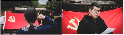 新党员入党宣誓仪式在庄严的国际歌中开始。首先由第二党支部书记刘铭同志宣读参加本次入党宣誓仪式的新党员名单。参加本次入党宣誓仪式的预备党员有张艺、杨旭、邹志伟、侯博、张智建、郑炳辉、高海燕、蔺忠杰。在刘铭同志的带领下,8名新党员举起紧握的右手,面对党旗,神情庄重,宣读誓词。播音与主持艺术专业1511班的侯博同志代表新党员做了表态发言,表达了对党的深厚感情和为党的事业奋斗终身的决心。