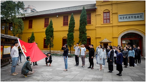 2018年9月11日,艺术设计系党总支在云南省陆军讲武堂举行了隆重的新党员入党宣誓仪式。参加此次大会的有艺术设计系党总支副书记陈烨伟同志、第二党支部书记刘铭同志、艺术设计系党总支专职组织员安淑蕊同志、艺术设计系分团委书记罗云华同志和8名新发展的党员。艺术设计系分团委学生会学生干部和部分入党积极分子代表观摩了仪式。
