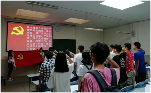2018年8月30日下午16:00,“信息工程系党总支2018年上半年预备党员入党宣誓仪式”在润泽楼201举行。参加此次活动的有党总支组织委员范贞皇老师,组织员胡燕梅老师以及18名新发展的党员。