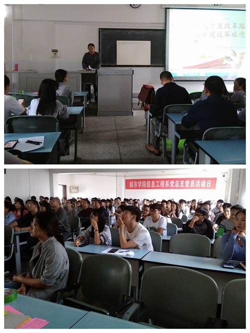 信息工程系党总支经过为期一个月的精心筹备,于2018年9月27日下午在明虹楼606教室开展以“春风十里改革路 强军建设军旅情”为主题的党员活动日。本次党员活动日由总支副书记王伟平同志主持,信息工程系教工党支部,学生第一、第二、第三党支部和入党积极分子共计160余人参与。吕建国副院长到场指导。