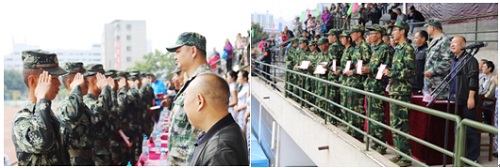 学生工作部(处)、武装部梁耀处长代表学校对2000名受训学员检阅,在分列式中,十四支受阅方队喊着嘹亮的口号,迈着整齐的步伐,昂首挺胸地走过主席台;擒敌拳、摔擒、队列、应急棍、匕首操5个表演科目引得现场掌声不断,充分展现了我院学子恪守“勤思笃实、知行合一”的院训、践行“明德任责、致知力行”的校训,不断追求卓越的精神品质。