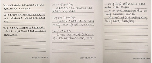 “写”,从“两个一百年”奋斗目标到“中国梦”,从统筹“五位一体”总体布局到协调推进“四个全面”战略布局,从把握中国经济发展新常态到牢固树立五大发展理念……以习近平同志为核心的党中央治国理政的新理念新思想新战略不断发展,推动着中国特色社会主义不断迈向新境界。机关直属党支部党员通过集体默写“五位一体”总体布局、“四个全面”战略布局和“两个一百年目标”,使广大党员认识到“中国梦”的实现是由每一个人的“小梦想”汇集而成,在于我们每一位公民的身体力行,贡献的每一份力量,从而促使我们为实现“小梦想”和“中国梦”努力学习,勤奋工作,“不忘初心牢记使命砥砺前行”!
