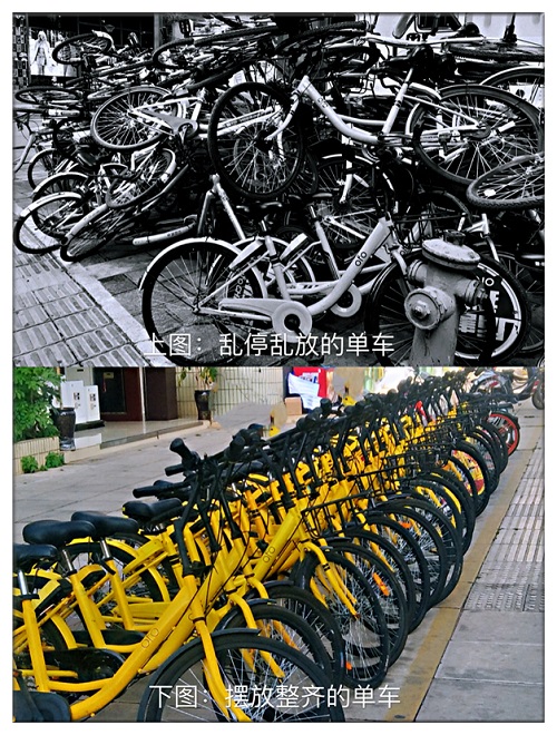活动开始之前队长将所有人员进行分组,围绕学院周围的各街道、各个单车停车点逐一进行检查、整理。各小组到达指定街道后开始对单车进行整理。首先,我们把倒在地上的单车逐一扶起,看到有摆放位置不合理的单车将其停放到单车停车点。其次,有的单车停靠在马路上,我们就小心翼翼的把单车扛到单车停车点。