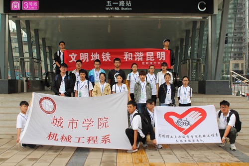 为弘扬“奉献、友爱、互助、进步”的志愿服务精神,培养同学们“吃苦耐劳,奉献社会”的意识,2018年5月12日、13日,昆明理工大学城市学院机械工程系志愿者服务分队在五一路地铁站、潘家湾地铁站开展了“文明地铁 和谐昆明”志愿活动。