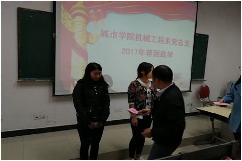 2017年12月7日,机械工程系党总支结合我系实际,针对学习生活困难的学生,在党员教师中积极开展帮困助学送温暖活动,努力创造和谐校园。我总支要求党员教师做到掌握家庭困难学生的实际情况,满腔热忱地为这些家庭困难的学生做好事、办实事、解难事,不断创新帮扶形式,拓展帮扶内容,推动“送温暖”行动逐步走向经常化、制度化。