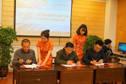 2017年12月11日,现代虚拟仿真VR/AR产学研工作室校企共建合作协议书签约仪式在昆明理工大学城市学院创智楼308举行。城市学院院长樊刚、副院长钟嘉玉、云南三耳科技有限公司总经理聂炜、云南策蓝科技有限公司总经理杨智、院长助理李华、艺术系主任余敏、信息系主任晋帆、建筑学系主任顾敬立、机械系主任彭澎等出席了签约仪式。