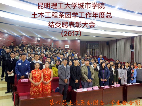 2017年11月18日19时,土木工程系分团委在昆明理工大学城市学院报告厅举行了土木工程系团学工作2017年度总结受聘表彰大会,与会的老师及嘉宾有:土木工程系副主任倪婷老师、土木工程系分团委书记李媛媛老师、17级造价班主任孙家昌老师、历届土木系分团委•学生会学生干部代表;土木系各班班长、团支书以及受聘、表彰的全体同学。大会由第六届土木工程系学生会主席李宰亨主持。本次表彰大会旨在总结本年度我系分团委•学生会的工作成果以及对过去一年工作中的不足进行深刻反思,规划分团委•学生会未来发展计划。