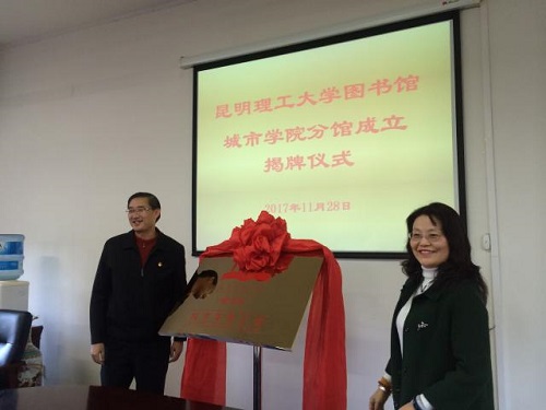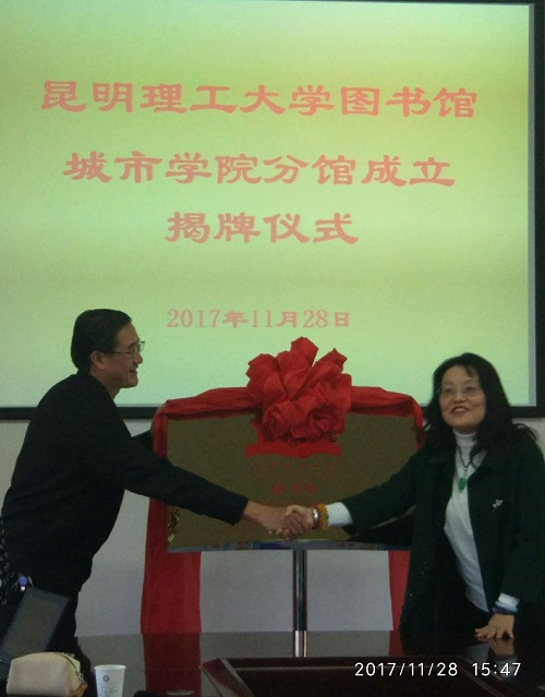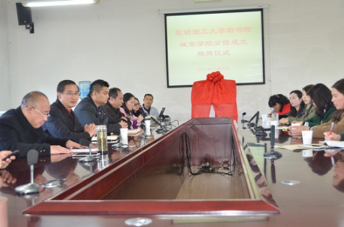 2017年11月28日下午,在城市学院德信楼4楼会议室举行了昆明理工大学图书馆城市学院分馆揭牌仪式。揭牌仪式由城市学院吕建国副院长主持。昆明理工大学城市学院院长樊刚,昆明理工大学图书馆常务副馆长甄晓霞分别代表学院和学校图书馆,对城市学院分馆的挂牌,表达了祝贺。城市学院有关领导,学校及学院图书馆部分职工代表参加了揭牌仪式。