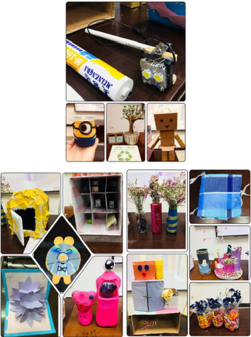 主持人宣布比赛开始之后,参赛选手按照赛前抽取的序号依次上台进行作品用料、用途、制作思路等的讲解,讲解结束后将作品放至展示区进行展示。展示台上的作品个个都新颖独特,创意满满,用纸盒改造的纸盒人,不仅外形逼真、造型独特而且还可以作为纸巾收纳盒;废旧果汁瓶改造成的琉璃瓶给人以小清新的视觉体验;废旧电器改造的多功能台灯充分体现了每一个废旧电池的意义,绿色环保;枕头套做的挂袋,还可以变身为挎包,一物多用;牛奶盒改造的收纳盒外形新颖,容量大,而且还方便实用。每一件参赛作品都充分体现了“物尽其用,变废为宝”的大赛主题。经过评委投票与选手互投环节后,作品《多功能台灯》获得比赛的一等奖;作品《绿色盆景,践行环保》与《阿楞人偶纸巾盒》获得比赛的二等奖;作品《小黄人储存罐》、《总有归期》和《神奇收纳包》获得比赛的三等奖。