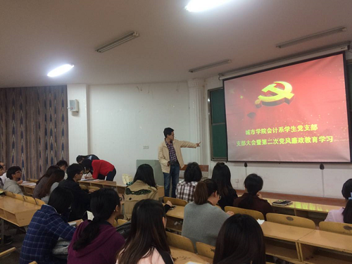 2017年10月26日,会计系学生党支部在梓韵楼101教室召开以“支部大会暨第二次党风廉政教育学习”为主题的10月党员活动日。会议由会计系组织员胡晓娜老师主持支部大会。