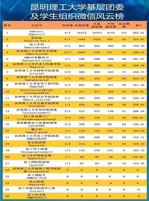 2017年9月11日发布的《昆明理工大学基层团委及学生组织微信风云榜》中,城市学院团委微信公众号kmustcc再次荣获第一,WCI为603.81。
