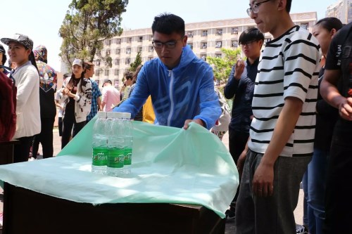 参赛者抽出放有装有水的瓶子下的桌布,在抽出桌布的同时瓶子不能倒下,则游戏成功完成一次。每支队伍有六次机会。(每成功一次,队伍接力的时间减少5秒)