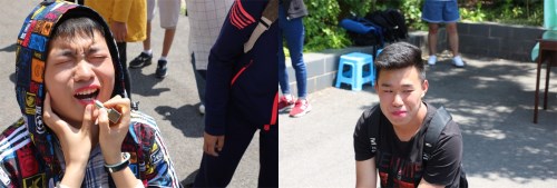 每队派出一男一女,女生蒙眼从5米外走向坐在椅子上的男生,为男生画口红。游戏过程为一分钟,由计时人员报时,必须在一分钟以后才能进入下一轮。以嘴唇画的漂亮者获胜。(达到标准的每支队伍总计时减少10s)