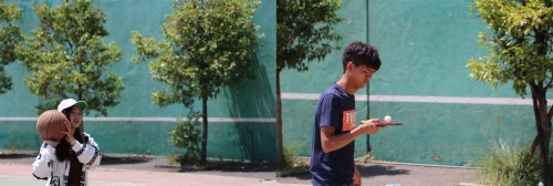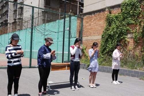 每队派一名女生在罚球线投篮,女生投中后,男生手持乒乓球拍,托着乒乓球绕篮球球场跑(乒乓球掉了要回到起点重新开始哦),力求最短时间完成。大家都很认真呢~