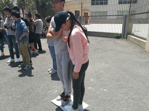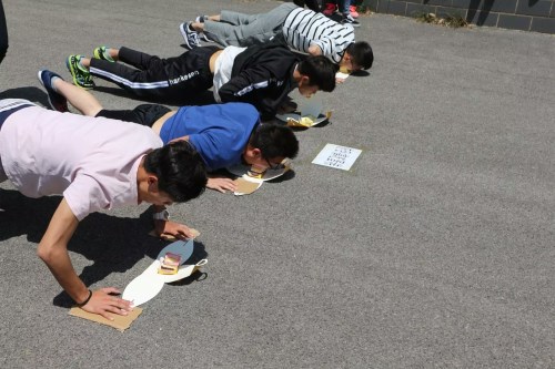 裁判说一句只有六个字的话,一共五句,两名同学(一男一女)站在报纸上,将裁判的话反着说出来。如果答错报纸就要对折,但是两名同学的脚不可以碰到地上。ps:游戏效果大家自行脑补,这大概就是单身狗的福利了吧......
