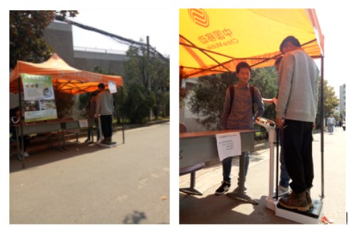 3月24日 12:00-14:00学生会生活部在天桥下搭设帐篷开展“一对一测健康指标”,摆设体重秤方便同学们通过测量自己的体重和身高来简单的获知自己的健康指标。