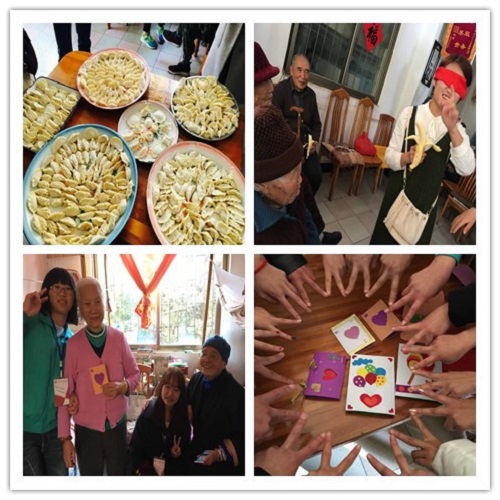 志愿者们怀着激动的心情到了敬老院,热情的和爷爷奶奶们问好后,就开始分工行动。第一环节志愿者们帮忙打扫卫生,出黑板报,表演节目,陪老人谈心拉家常,一位80多岁的奶奶与我们分享自己当年生活的艰辛与不易,并告诉我们要珍惜今天的幸福生活。第二环节是游戏互动,“一对一,默契大比拼”,每位志愿者只能给一位老人“喂香蕉”,活动参与者需蒙上眼睛,按照主持人的提示前进,用时最少的一组胜出,爷爷奶奶们都玩得很开心,现场笑声不断,气氛温情无限。第三环节志愿者为爷爷奶奶们送上提前制作的手工贺卡,附上对老人们满满的新年祝福。最后,是包饺子“比一比,谁厉害”,每位志愿者都积极参与,想把最独特最可口的饺子包给爷爷奶奶们。整个下午的活动尽管很累,但看着爷爷奶奶们幸福开心的笑容,每一位志愿者的心里洒满了阳光。