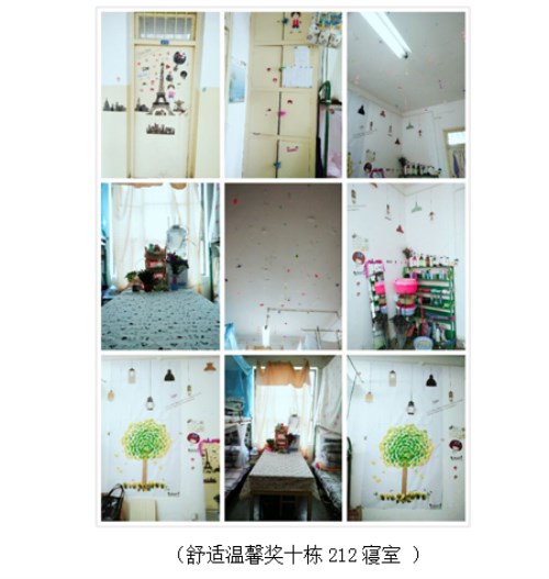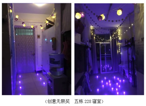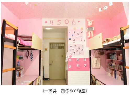 比赛分为两轮,第一轮为评委会打分,取评分最高的前十间寝室,进行第二轮微信平台投票环节,票数最高的前三间寝室分为获得一、二、三等奖,还会投出创意无限奖和舒适温馨奖。四十间寝室经过一周装饰,一周评分投票,最终获奖寝室终于公布啦!!一等奖花落四栋506寝室, 二等奖为一栋521寝室,三等奖为五栋507寝室,创意无限奖和舒适温馨奖分别由五栋228寝室和十栋212寝室夺得。