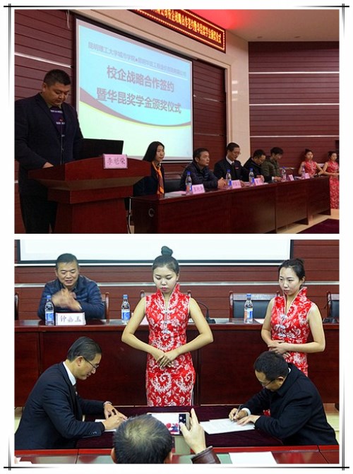 2016年12月22日上午10点,昆明理工大学城市学院与昆明华昆工程造价咨询有限公司校企战略合作签约暨华昆奖学金颁奖仪式,在昆明理工大学城市学院明虹楼报告厅举行。到场参加仪式的领导有:昆明华昆工程造价咨询有限公司总经理王敬良、总经理助理兼部门主任王艳华、昆明理工大学城市学院院长樊刚、昆明理工大学城市学院副院长钟嘉玉、城市学院土木工程系主任陈勇,土木工程系师生代表及华昆奖学金获奖学生也到场列席。签约暨颁奖仪式由昆明理工大学城市学院党委副书记李魁荣主持。