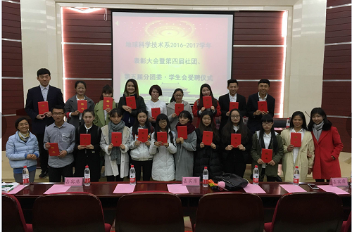 2016年12月1日12︰30,地球科学技术系2016—2017学年表彰大会暨第四届社团、第五届分团委.学生会受聘仪式在明虹楼报告厅正式举行。地球科学技术系副主任古兴伟老师、陈绩老师、赵旭刚老师、魏彬老师,分团委书记尹树佳老师,第四届专业社团干部和第五届分团委•学生会的全体成员,受表彰的各部门学生以及各班干部代表共计220人出席本次大会。