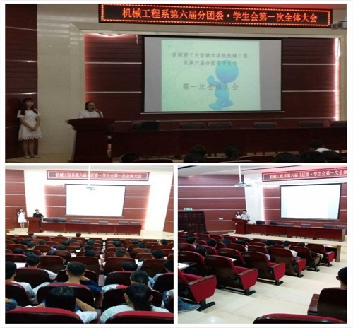 2016年10月9日19:00,昆明理工大学城市学院机械工程系第六届分团委•学生会第一次全体大会在明虹楼报告厅举行,机械工程系分团委书记赵娟老师,系学生会主席曾子阳,副主席韩楠、邹俊杰,分团委副书记黄政渊以及机械工程系学生会各部门成员参加了此次会议。本次会议由系学生会文艺部部长晏宝瑞主持。