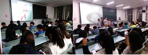 首先由机械工程系志愿者服务分队费玲果同学为大家讲述了艾滋病的发生和传播途径,同时为同学们普及了12月1日为世界艾滋病日及艾滋病标志—红丝带;之后,语言工程系志愿者服务分队李野同学为在座的同学讲述了如何预防艾滋病和关爱艾滋病人。