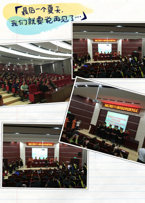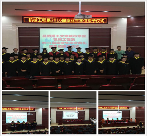 时光飞逝,还来不及回首,一眨眼便到了毕业季。带着深深的不舍和祝福,机械工程系分团委•学生会于2016年6月22日15:00在明虹楼报告厅举行了“昆明理工大学城市学院机械工程系2016届本科毕业生毕业典礼暨学士学位授予仪式”。出席本次毕业典礼嘉宾有城市学院副院长陈君若老师、城市学院副院长钟嘉玉老师、机械工程系主任彭澎老师、机械工程系张方老师、机械工程系张海兵老师,以及机械工程系各部门负责人和毕业班老师,毕业班同学。