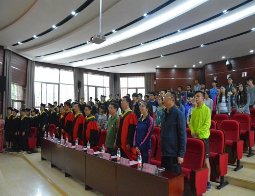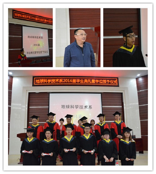 毕业典礼在庄严的国歌声中开始,首先,由昆明理工大学城市学院地球科学技术系夏永华主任为我系毕业生致辞,对于毕业生这四年的努力给予充分肯定,在2016届214名毕业生中,有7名同学将继续深造,200多名同学圆满完成学业,将开启自己的新航程,希望同学们不怕苦、不怕累、不放弃,继续书写灿烂人生,为理想勇往直前。随后,由昆明理工大学袁希平副校长发表讲话,他首先代表学院向圆满完成学业的2016届毕业生表示衷心祝贺与感谢,并提出自己的几点希望:希望同学们坚持自己的理想;希望同学们走上工作岗位不断提升自己的能力,持有“活到老学到老”的态度;希望毕业生用自己的所学融入时代,推动时代,与时代同行,成为时代的引领者。
