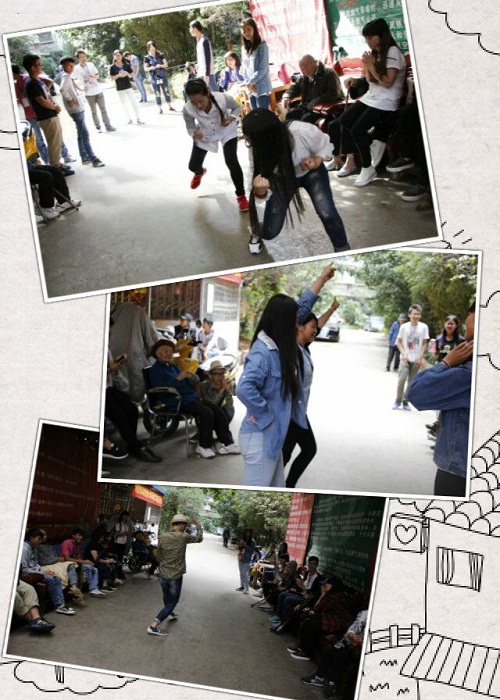 在本次活动中,志愿者看望了行动不方便的老人们,搀扶他们下楼散步,吹风,陪他们聊天,帮他们做一些力所能及的事。老人们很乐意和我们分享一些自己的故事,自己认识的世界。同时,为了给敬老院的爷爷、奶奶们带来欢乐,我们的志愿者小伙伴也很尽力,分别表演了街舞、歌曲《强军战歌》、军体拳、舞蹈《小苹果》、《韵律操》等节目,展示了当代大学生的精神风貌。