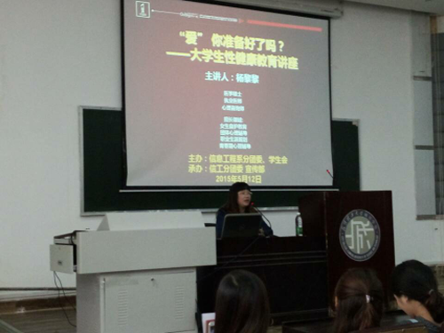 信息工程系针对这个问题举办了“‘爱’你准备好了吗?”--大学生性健康教育。届时邀请了著名医学硕士、心理咨询师、执业医师杨黎黎老师为我院学生对性无知的危害、女生的自护教育等话题展开了细致的讲解。报告厅座无虚席,同学们兴致勃勃的聆听了这场讲座。