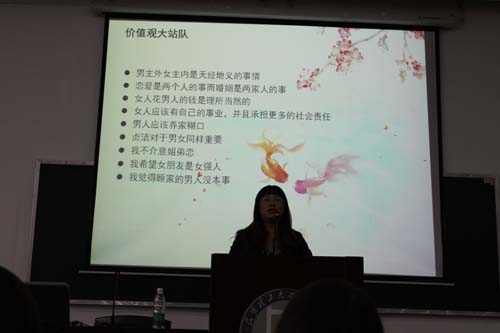 讲师从价值观说起,让同学们正确认识到在恋爱方面的价值观,又分别从女生和男生择偶标准讲起,一步一步进入话题男女基本的择偶观。最后在如何处理恋爱中的关系,重点提到要考虑到父母,恋爱也许是两个人的事情,而婚姻则是两个家庭的事情,但问及我们为什么恋爱的时候,讲师解答到为了找一个志同道合相互欣赏的终身伴侣是恋爱的目的。