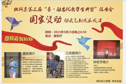 为响应党十八大提出的“提高家庭经济困难学生资助水平,让每个孩子都能成为有用之材”的号召,昆明理工大学城市学院地球科学技术系按照第二届“国家资助助我飞翔”全国励志成长成才优秀学生典型宣传评选活动的要求,于2015年5月15日18:30在明虹楼报告厅召开了地科系第三届“寻•励志优秀学生典型”报告会。本次活动有幸邀请到“云南省大小手爱心社” 发起人钟若予女士、“2014年度云南省优秀共青团干部”夏新老师、“2014年度云南最美大学生-自强之星”江先傲同学三位嘉宾以及我院学生工作部部长郭小辉、地科系副主任魏彬、辅导员张娜、尹树佳四位老师的到场。