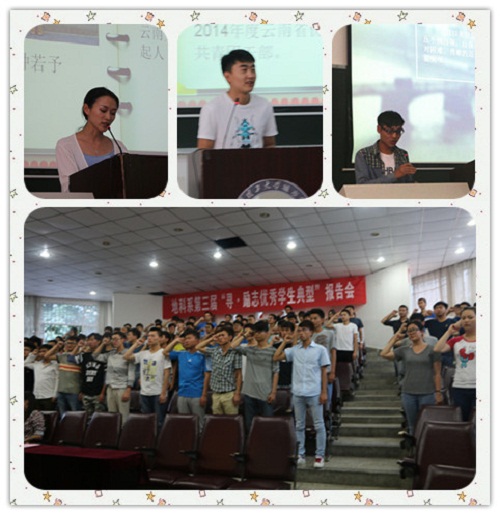 榜样的力量是无穷的,他们心怀感恩,用自己的付出为社会增添了一抹暖色,擦出生命的火花,他们身处平凡的岗位,但奋发向上,创造出生命无限的价值,他们怀揣梦想,不畏千难万险,奋发进取,坚持勤学、修德、明辨、笃实。他们值得所有大学生学习,时刻将这八字箴言牢记于胸,付诸于行,相信在今后一定能够用青春坚强的臂膀扛起时代的重任,用青春的面庞装点祖国的容颜,用奉献的笔触书写壮美的诗行。最后,在地科学子的励志宣誓中,本次报告会圆满结束。