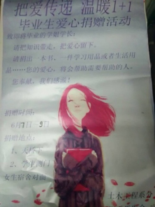 本次活动从2015年6月7日9点起至2015年6月9日19点结束,三天下来,我们的收获很大,全院毕业生们捐赠的东西多种多样,爱心的传递不在于捐多捐少,也不在于所捐物品的价值,而是在于我们每个人的一份爱心以及给别人带来的帮助。