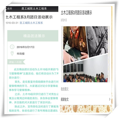 为践行社会主义核心价值观,进一步在全院形成做好事做善事做志愿者的良性互动,树立“学习雷锋、奉献他人、提升自己”的志愿服务风尚,推动志愿服务工作常态化发展。我院团委及各系分团委积极开展学雷锋志愿服务月系列活动。以学习雷锋精神,继承雷锋精神为出发点,以践行社会主义核心价值观、践行雷锋精神为落脚点,结合新媒体平台,不断推进我院志愿者服务文化建设。