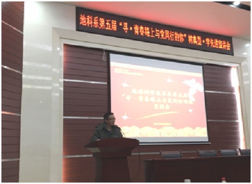 青春是我们前进的脚印,大学是实现梦想的开始,为了庆祝党十九大的胜利召开,表彰我系在学习工作和生活中的优秀典型人物,传承我系“树典型•学先进”的优良传统,指引同学们树立正确的人生目标,营造良好的“向榜样学习”氛围,地球科学技术系于2017年12月20日19点在明虹楼报告厅举办了第五届“寻•青春路上与党同行的你”树典型•学先进宣讲会。出席本次宣讲会的嘉宾有地科系主任夏永华老师、副主任魏彬老师、学工办主任张娜老师、勘查教研室主任赵虹老师、水文教研室主任吴倩老师、分团委书记尹树佳老师,班主任代表杨文俊老师、颜海娟老师、陈加宽老师、侬阳霞老师以及我系200余名同学。