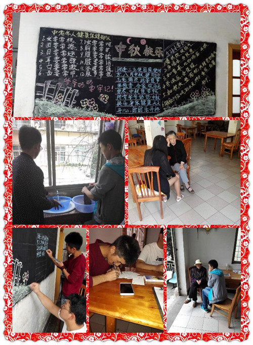 9月26日14点,我系志愿者以“爱驻夕阳,关爱老人”为主题的敬老院活动也同时开展,与敬老院的负责人完成交接工作后,志愿者们将精心准备的“养生贺卡”送给老人。围绕“中秋养生”为主题为老人出板报,提示健康知识;帮忙打扫卫生,为老人们创造一个干净舒适的节日环境;陪老人聊天,倾听老人们的故事。此次活动在给老人带去温暖的同时也展示了当代大学生积极、乐观、向上、富有社会责任感的风采,并得到敬老院老人的一致好评。