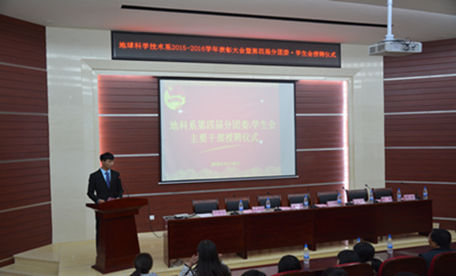 2015年11月10日12:30,地球科学技术系2015-2016学年表彰大会暨第四届分团委、学生会受聘仪式在明虹楼报告厅召开。出席本次大会的嘉宾有学生工作部部长郭小辉、团委书记夏新、地科系主任夏永华、副主任陈鸿兴、副主任陈绩、副主任魏彬、辅导员张娜和尹树佳以及2015级各班班主任、受表彰的各部门学生。