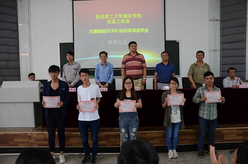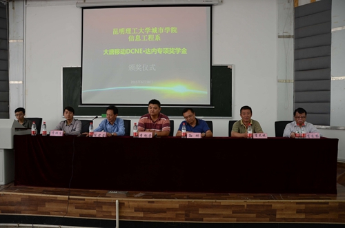为奖励在科研创新、技能竞赛中取得优异成绩的同学,6月18日下午,“昆明理工大学城市学院大唐移动DCNE•达内专项奖学金颁奖仪式”在我院明虹楼报告厅隆重举行。城市学院党委副书记孙刚、李魁荣,城市学院副院长陈君若、肖灵琥,大唐移动通信设备有限公司云南办事处服务总监肖良攀,大唐移动通信设备有限公司云南办事处网络业务经理李雄林,达内科技有限公司昆明春城路中心主任贾强生,城市学院院长助理李华,学生工作部主任郭小辉,团委书记夏新,信息工程系主任晋帆,副主任吴世林、王伟平以及专业负责人出席了颁奖仪式。颁奖仪式由信息工程系辅导员朱玲主持。
