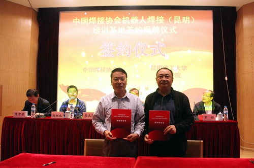 昆明理工大学校长助理、城市学院院长袁希平和中国焊接协会副秘书长吴九澎分别代表合作双方签署了中国焊接协会机器人焊接(昆明)培训基地的授权协议。