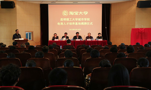 昆明理工大学校长助理、城市学院院长袁希平与云南硕方网络科技有限公司董事长张文艳共同为淘宝大学昆明理工大学城市学院电商人才培养基地揭牌。