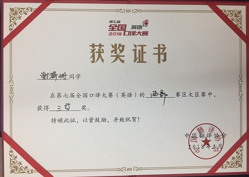 城市学院语言工程系翻译1411班谢漪珊同学荣获第七届全国口译大赛(英语)西南赛区大区赛三等奖