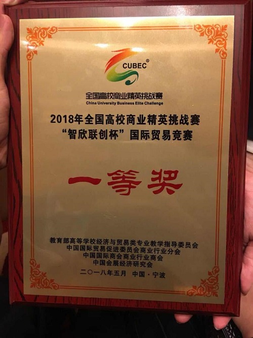 2018年全国高校商业精英挑战赛“智欣联创杯”国际贸易竞赛全国总决赛,于5月24日~28日在浙江省宁波市举行,由我院管理与经济系选派的国贸专业1511蓝引、国贸专业1611李悦、徐梦婷、杨磊、营销专业1511李翔、智电专业1611郑启任组成的参赛队在刘红梅、翁玮老师的指导下喜获此次大赛“一等奖”的好成绩!