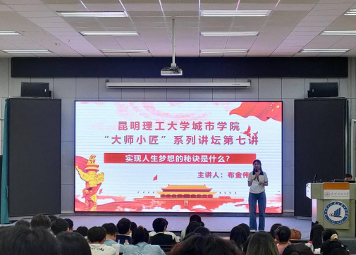 2023年5月31日19点,由城市学院团委、学生工作部主办,昆明理工大学“匠·心”师生工作室承办的“大师小匠”第七讲“实现人生梦想的秘诀是什么?”主题讲座在建工200报告厅组织开展,本次讲座邀请了昆明理工大学国土资源工程学院布金伟教授作为主讲人,城市学院团委书记、“匠·心”师生工作室主持人魏彬老师,学工部常述源老师及近200名同学参加了本次讲座。