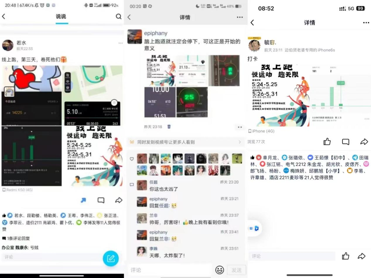 在活动期间,虽然天气炎热,但却一点没有影响同学们的参与活动的热情,越来越多的同学走出宿舍,投身体育锻炼。本次活动按公里数、累计时长、五天平均步数进行排名,活动期间在操场上、在跑道上、在健身房里都能看见同学们锻炼打卡的身影,朋友圈更是同学们运动成就的打卡地。