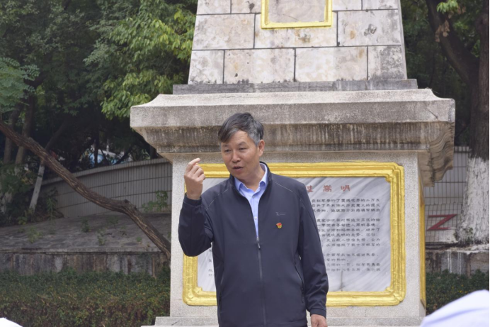 当全体人员抵达纪念塔前,嵩明县延安精神研究会主任尹春来老师为全体学员讲述了红军长征过嵩明的相关历史,感悟中国工农红军长征波澜壮阔的历史画卷,追思和讴歌了中国共产党领导下的工农红军,在敌我力量对比悬殊、革命环境困难复杂的情况下,进行的决然斗争和付出的巨大牺牲。