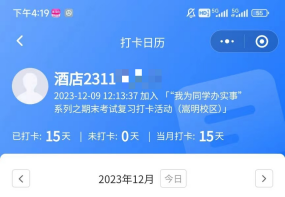 期末考试来临之际,为了营造浓厚积极的备考氛围,强化同学们的知识运用能力,引导同学们养成良好的学习习惯。昆明理工大学城市学院学生会于2023年12月11日-25日在呈贡、新迎、嵩明三校区开展“我为同学做实事”系列之期末考试复习打卡活动。本次活动约420余人参加。