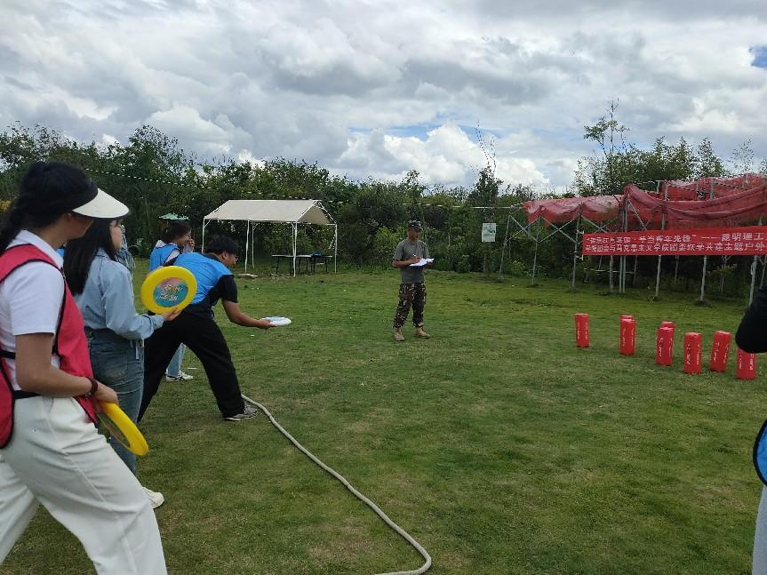 在素质拓展环节中,同学们在教练的引导下,开展了“飞盘对抗”“同心动力圆”两个活动,锻炼了同学们的团队合作能力和沟通能力。